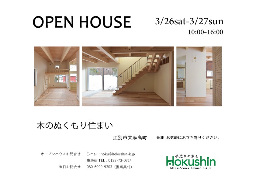 丸三ホクシン建設は平成28年春に、社屋向かいにモデルハウスをオープンさせました。石狩市花川南5条2丁目4番地にあります。自然素材をふんだんに使い、大工の技を駆使し、省エネ、創エネのアイデアも盛り込んだモデルハウスです。