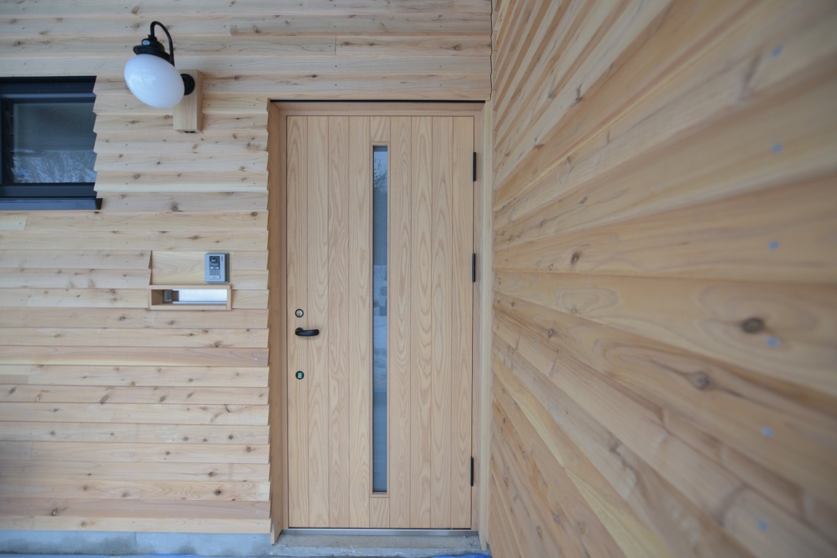 玄関廻り、土間空間の外壁板張りも いい感じです!! 内部の道産材のニレ床も スッキリした印象にまとまってます!