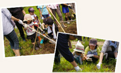 慣れないくわなどを使ってみんなで耕しハーブを植えました。