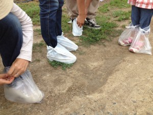 バスを降りて農園へ入る前に、靴の上にビニール袋を履いて・・・??