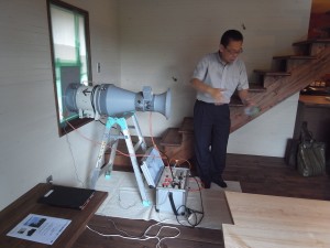 気密測定では 家全体の中にどれだけの隙間があるかを実際に数値で測り、日本電興さんにわかりやすく説明をしていただきました。