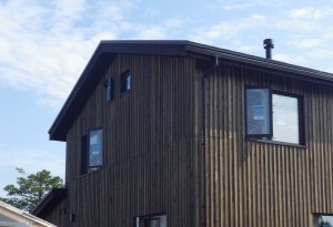 外壁は板張り。玄関土間には 薪ストーブ。