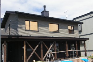 もう1件の北区では こちらも外壁は板張り。落ち着いた色に着色し 薪ストーブの煙突と下屋とのバランスがとても良い雰囲気を醸し出しています。