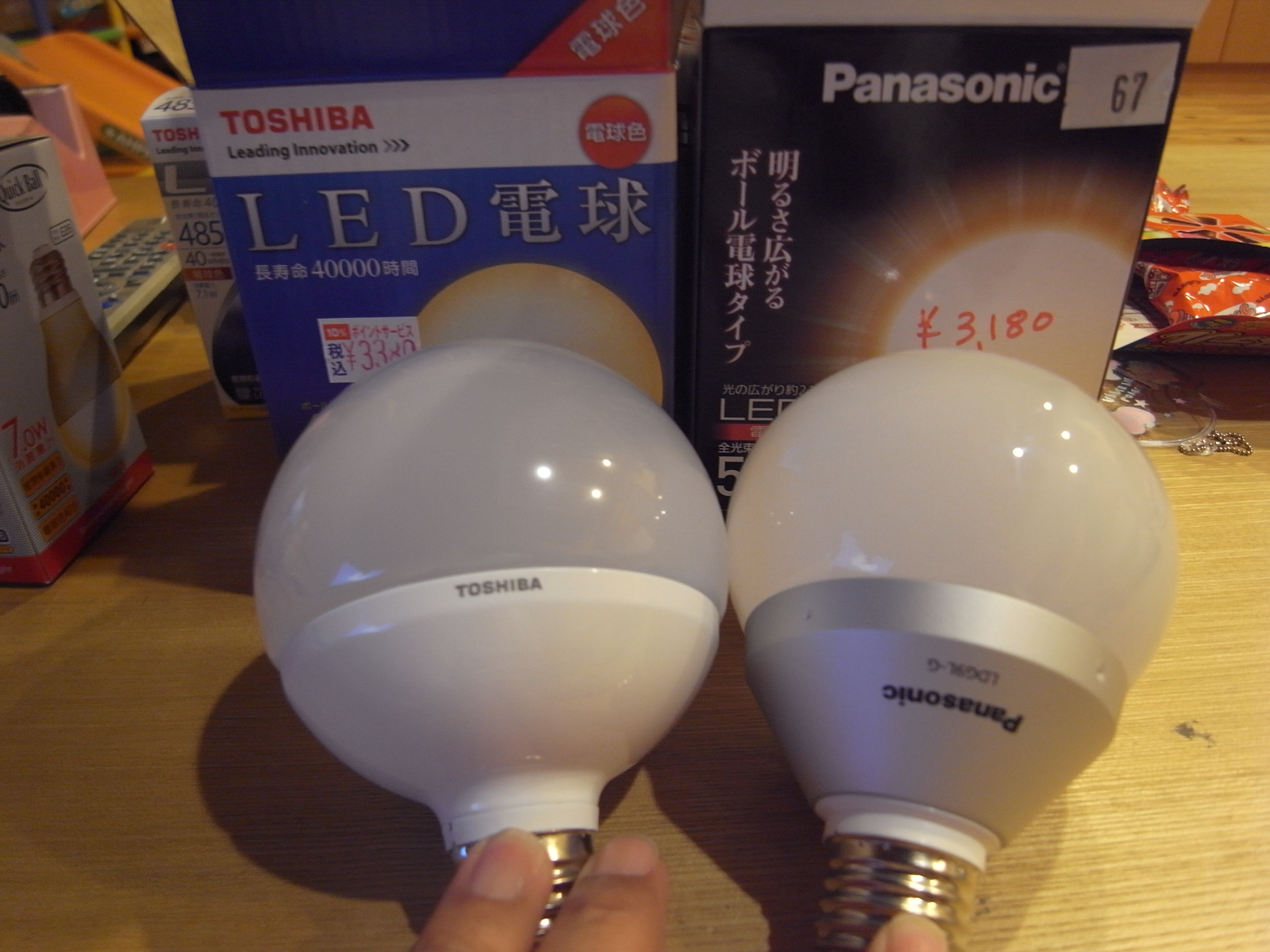 東芝は白く丸い形をしていて、同じボール型の蛍光灯タイプと見分けがつかないほどです。