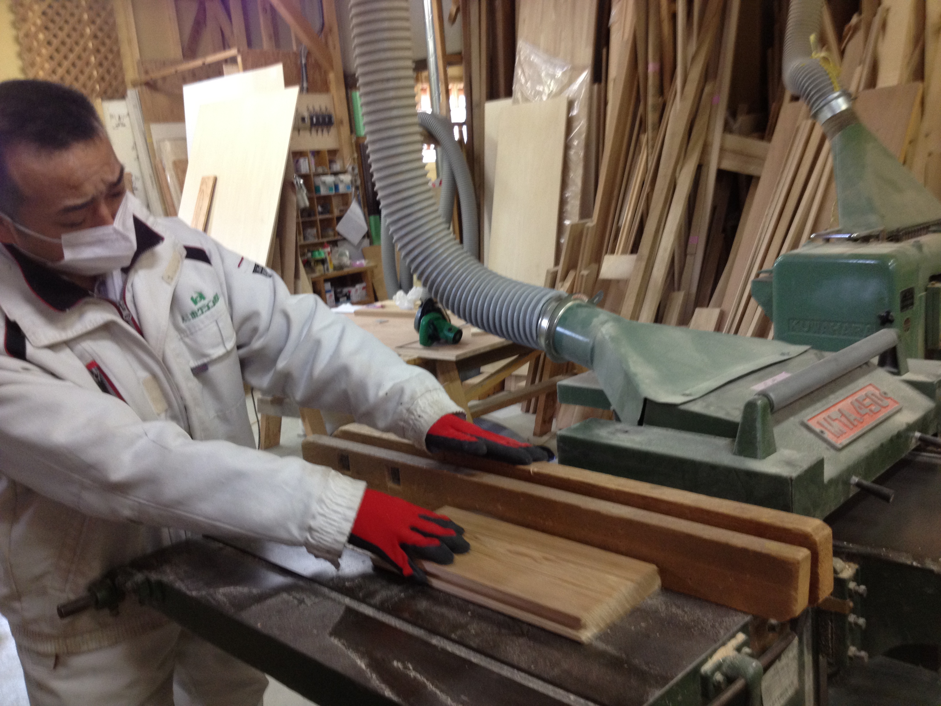 大きな杉の材料を削ってうすく加工していくのですが、結構 大変な作業なんです。