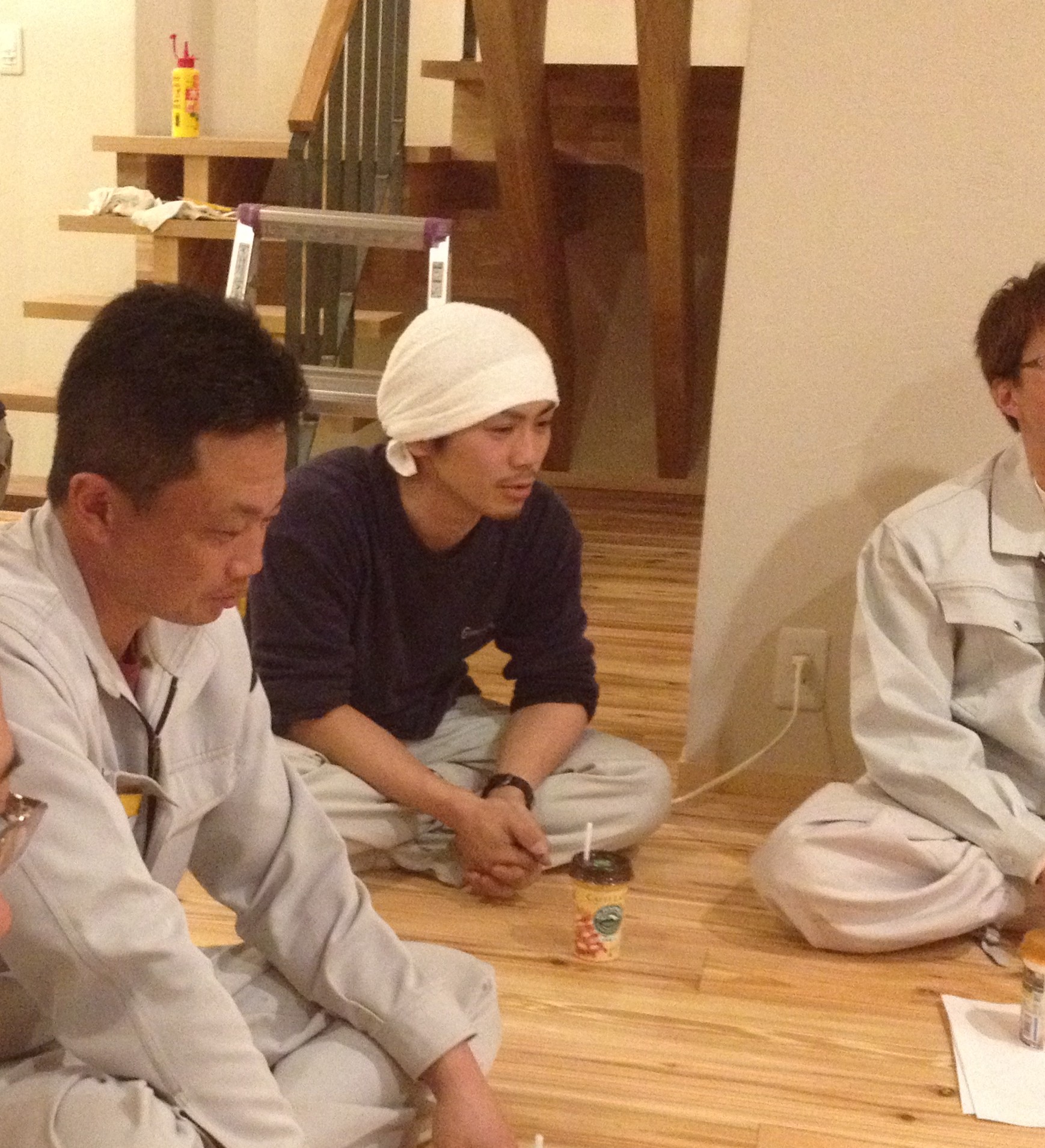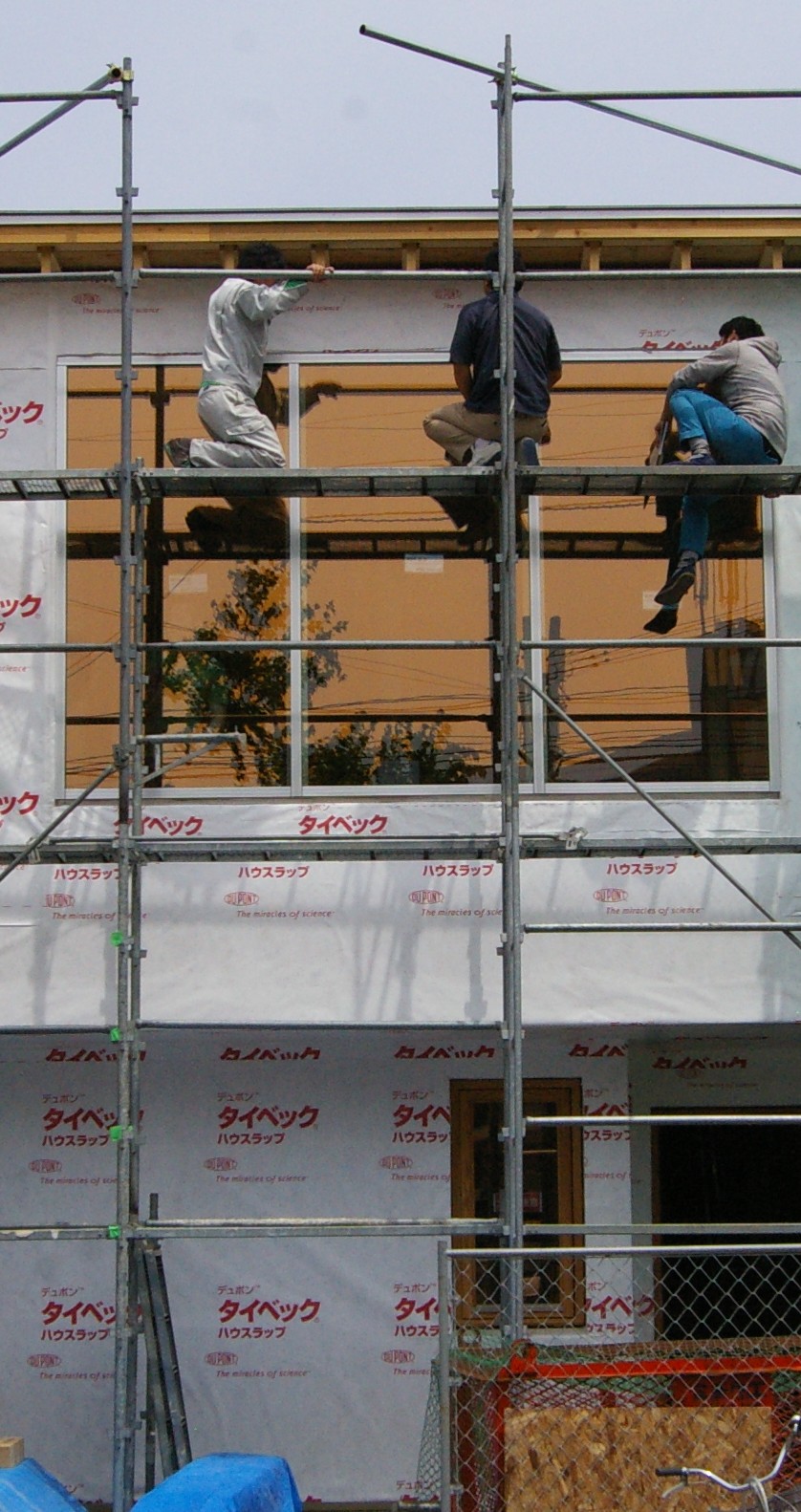 一方 上棟式を終えた現場では 壁の仕上げについて、設計、監理、棟梁で足場に座り込んで打合せです。