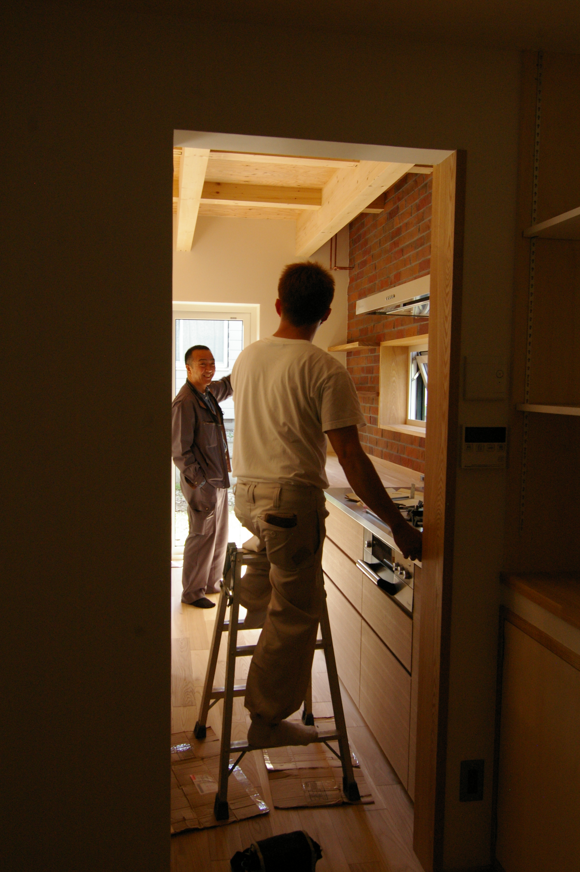 窓枠取り付けを 風が通り抜ける中、作業しておりました。ご苦労さまです!