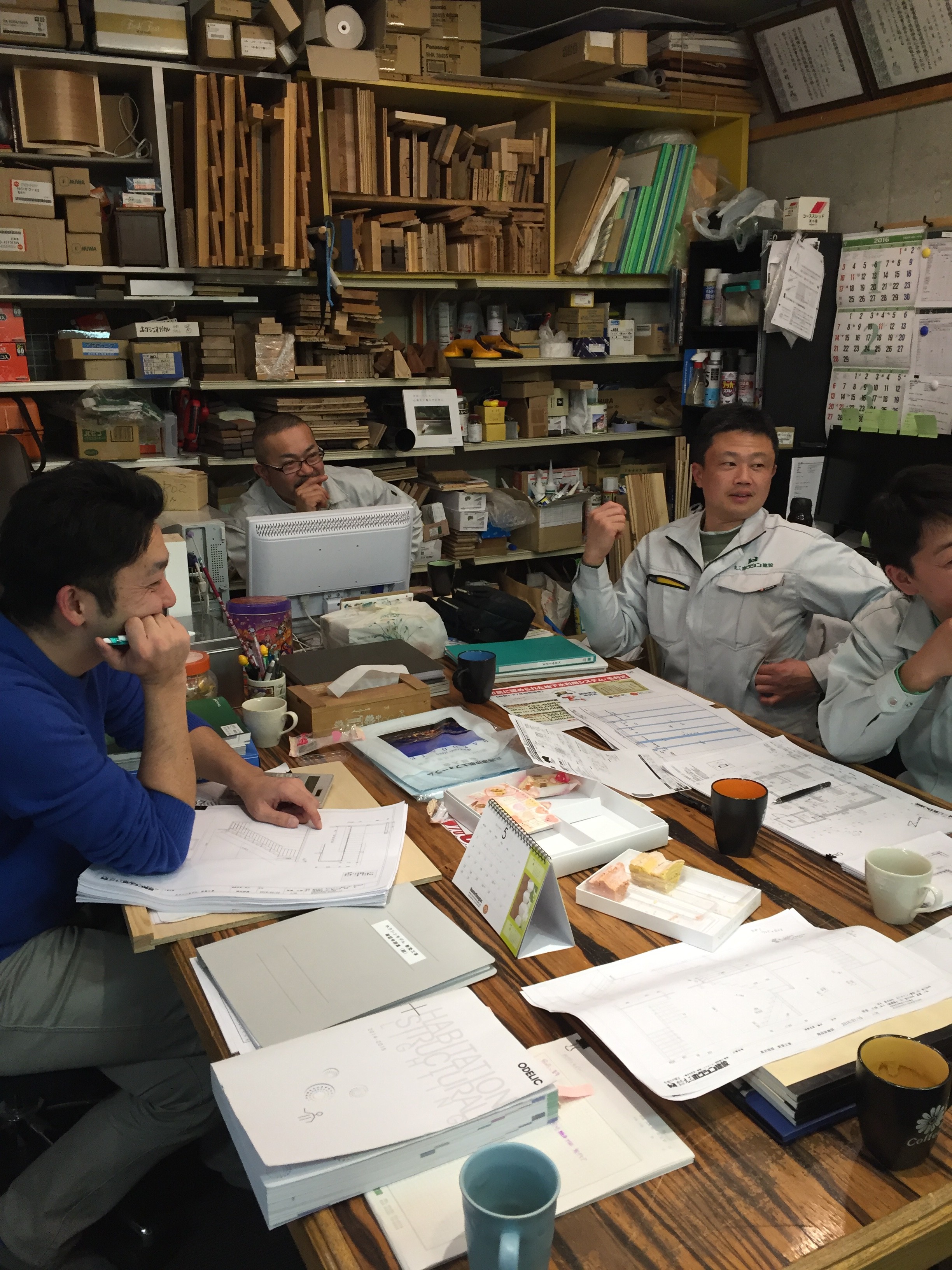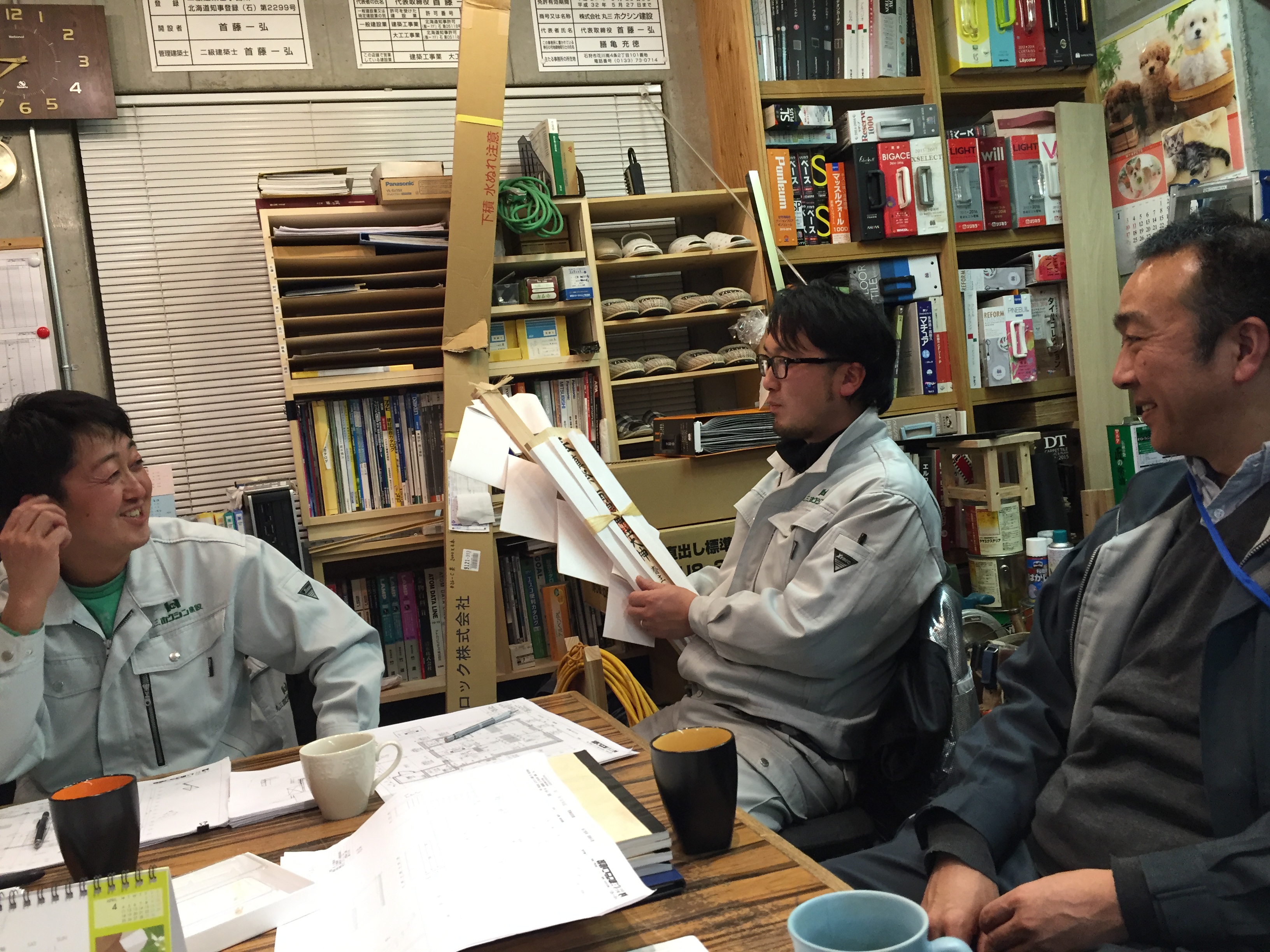 ということで、改めて お施主さんでもある首藤社長と、黒川棟梁、ホクシンスタッフが集まり打ち合せ。