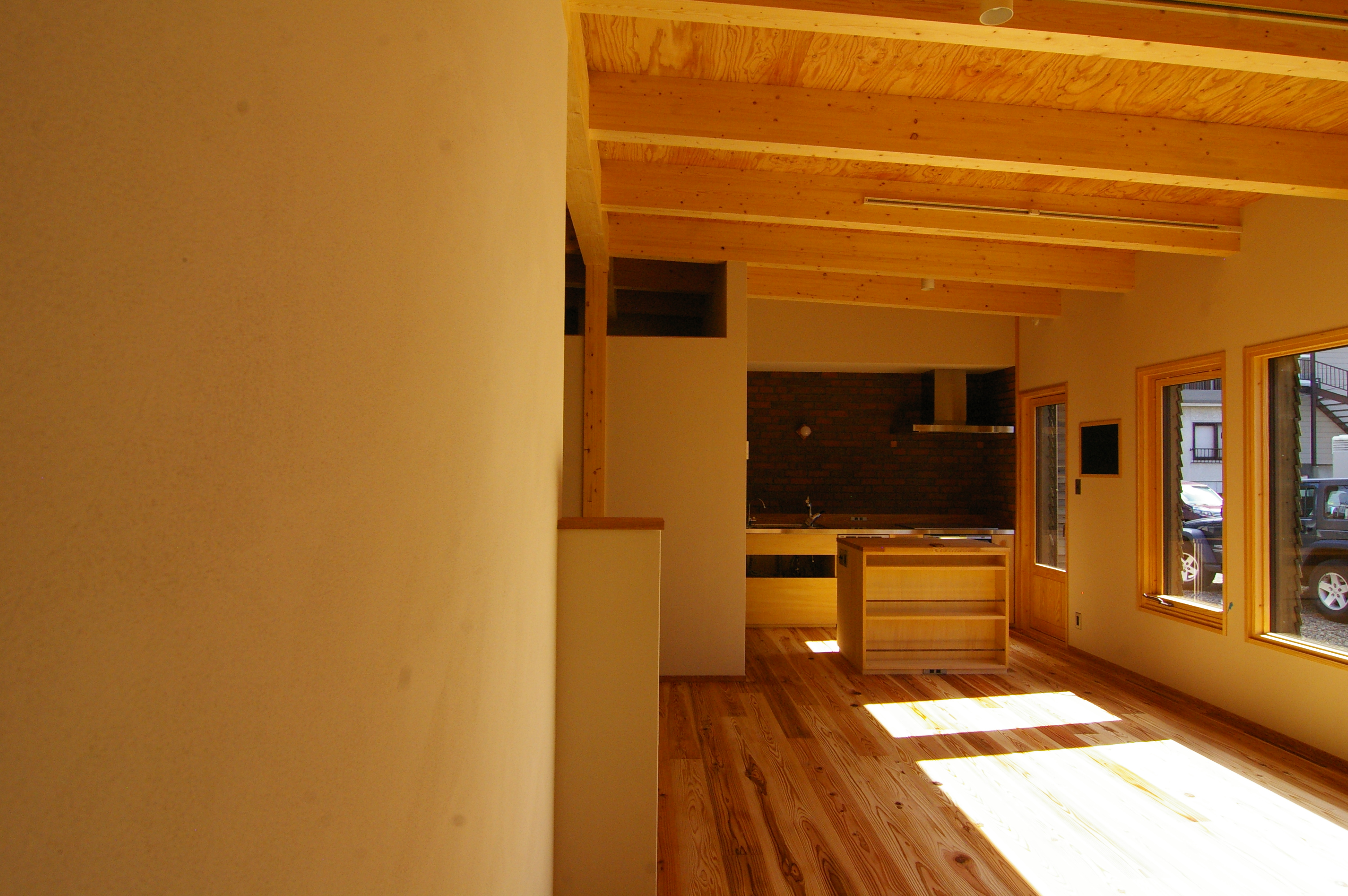 お庭を眺めながら 平屋ならではの広がる空間をイメージし、床は 杉の浮造りでクリアー仕上げ。明るく心地よい空間となりました。