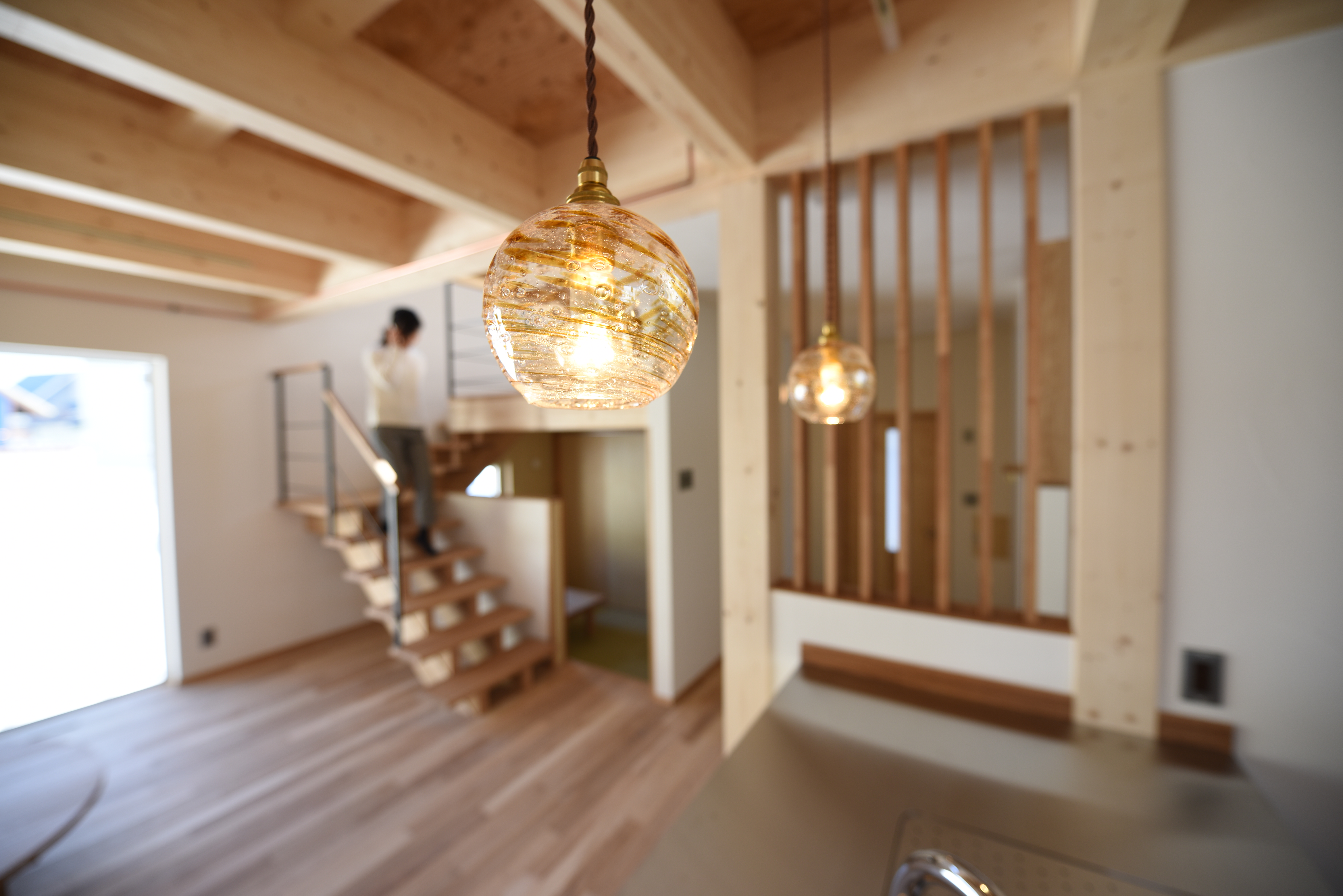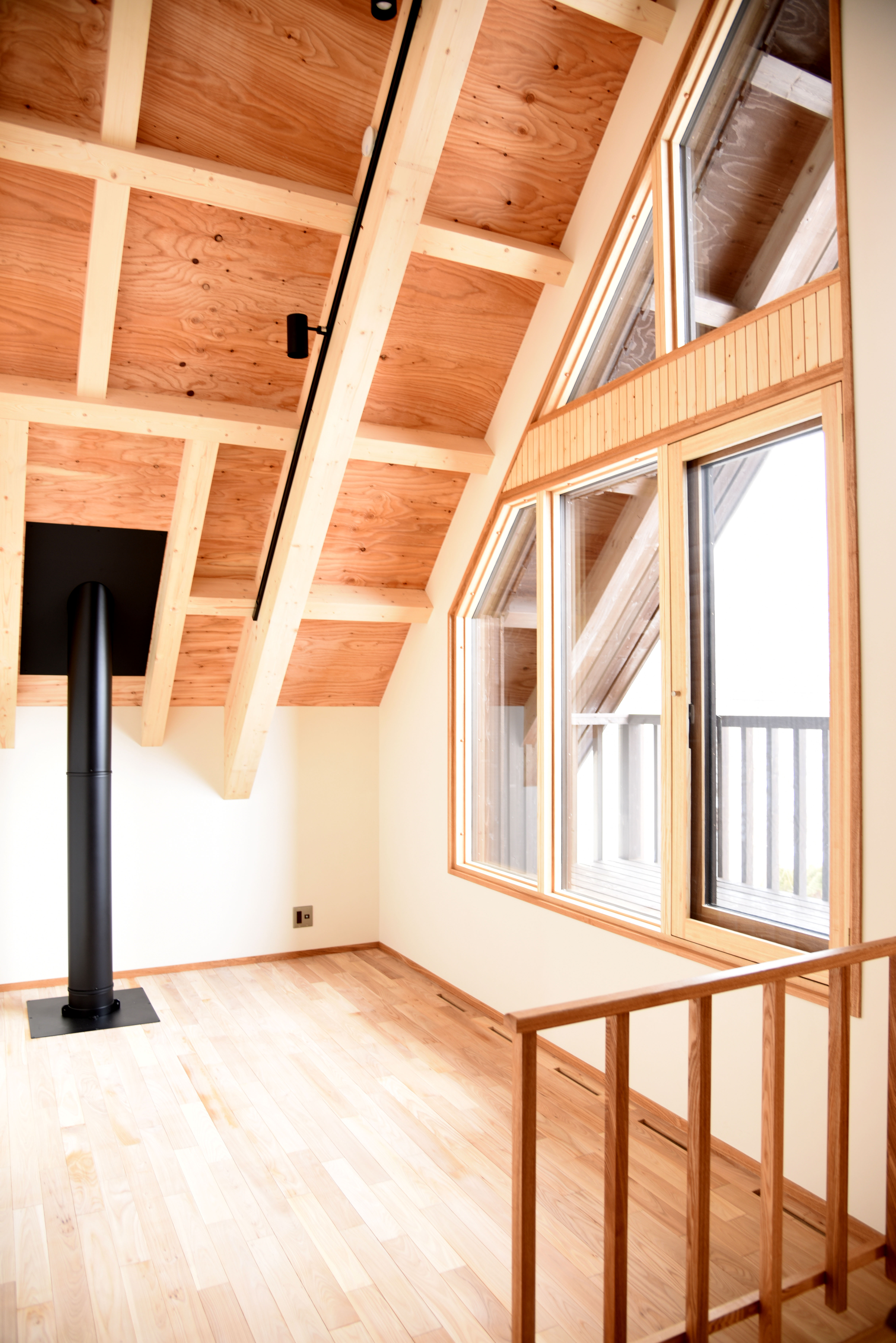 さらにもう一つは 三角屋根と屋根に沿った大きなの窓が特徴の家。小さいころからお父様の設計を見てきたというお施主様。お父様といっしょで木の風合いが好きという思いが 梁表しのダイナミックさに現れ、明るい空間となっております。
