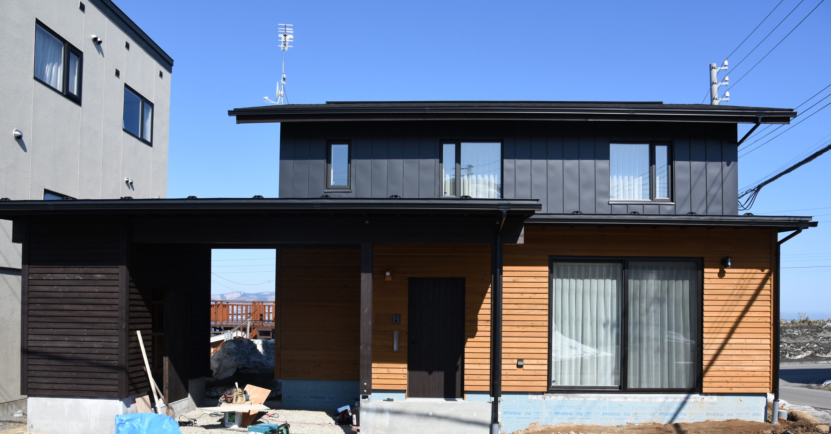 そして つい先日お引渡しさせて頂いた物件は 玄関から土間が続く空間にペレットストーブの火が揺らぎ、その様子を見渡すオープンキッチン。2階寝室からはアドリア海を思わせるような眺望。(そんなところ北海道にありましたっけ??そう思わせるような空間なんです!!)外観の仕上がりもクールに仕上がりました。